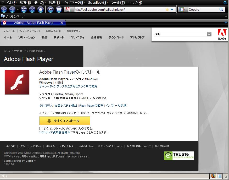 って事で,FireFoxでFlashのサイト (http://get.adobe.com/jp/flashplayer/)へアクセスしてインストーラーをDLする。