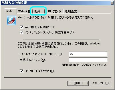出てくる[常駐タスクの設定]ウィンドウ内の[例外]タブをクリック↓